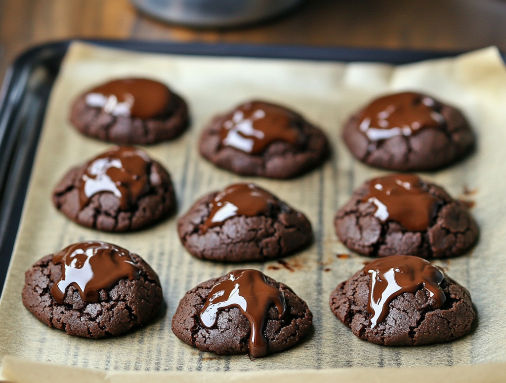 Rich chocolate cookies with a molten center and shiny crackly top, perfect for chocolate lovers looking for an indulgent dessert.