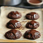 Rich chocolate cookies with a molten center and shiny crackly top, perfect for chocolate lovers looking for an indulgent dessert.