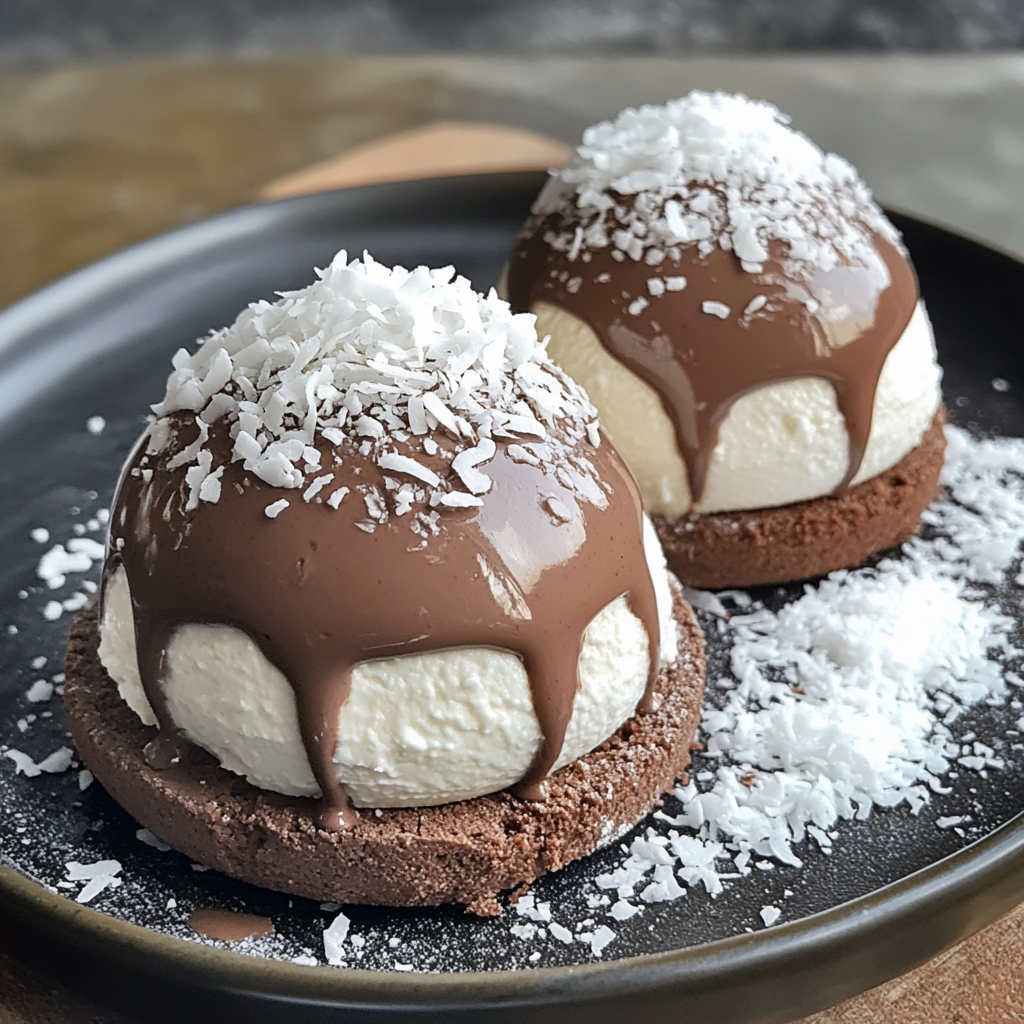 Coconut Dome with Chocolate Spread is a delightful dessert featuring layers of coconut mousse encased within rich chocolate shortbread, topped with gooey chocolate spread.