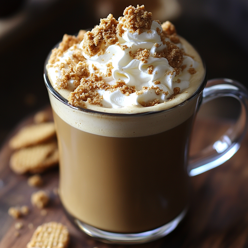 A Cookie Butter Latte is a delicious coffee drink that combines brewed espresso, warm milk, and cookie butter, topped with whipped cream and cookie crumbles.