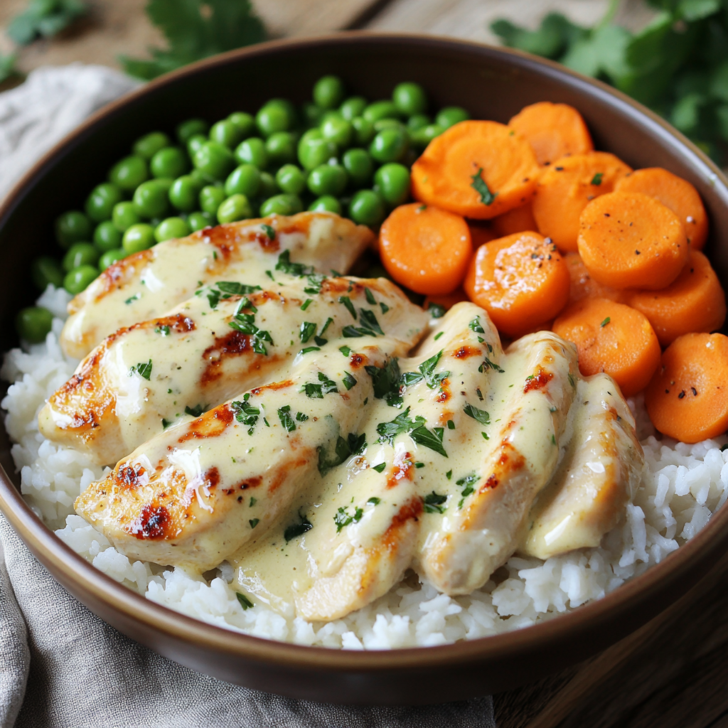 - Serve by layering the fluffy rice on plates, topped with creamy garlic chicken; arrange the glazed carrots and green peas on the side.