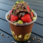 3. Top with toasted kataifi, pistachio paste, shredded coconut or chopped nuts as desired.