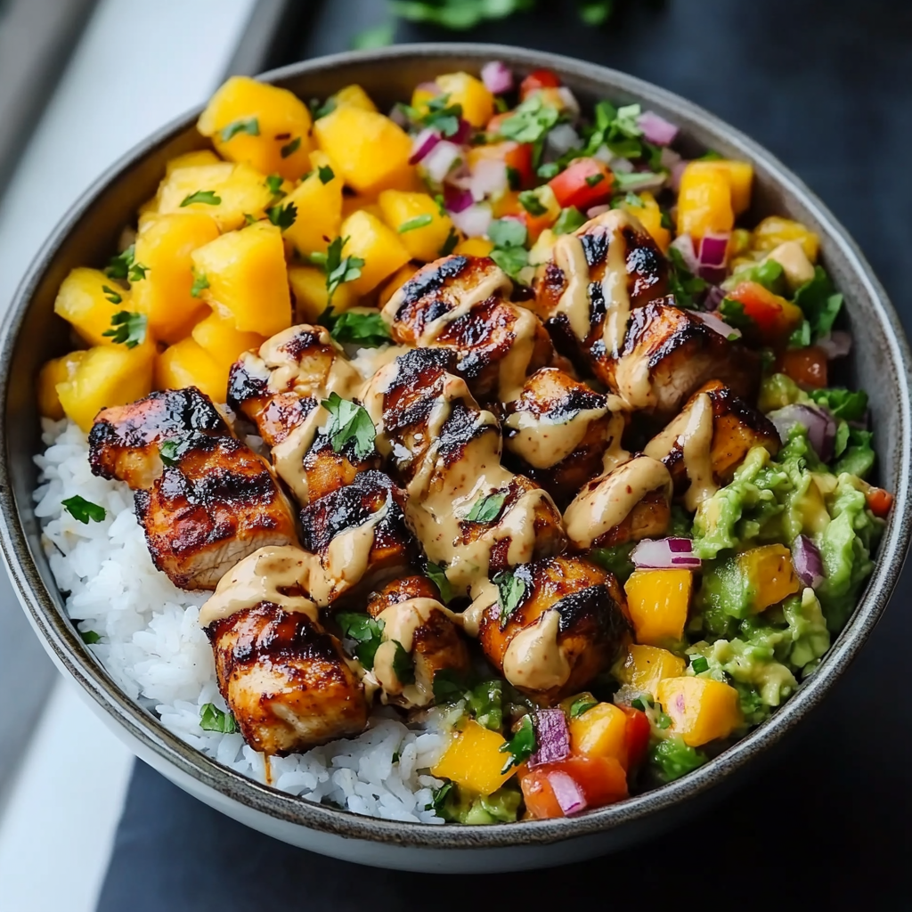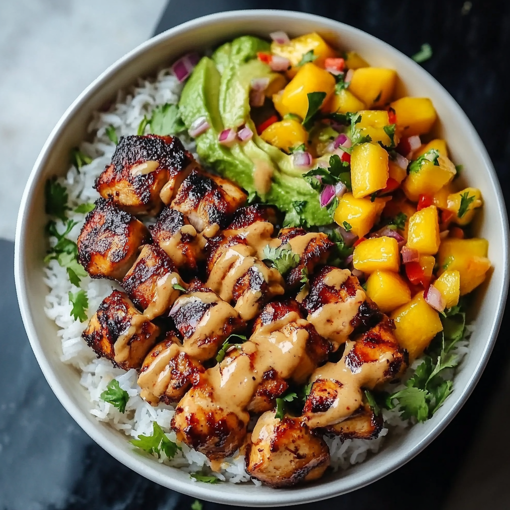 Grilled Maple Sriracha Chicken Bites with Coconut Rice & Mango Avocado Salsa Bowl with Chili Mayo is a stunning all-in-one meal that’s sweet, spicy, and fresh. This dish features juicy chicken bites coated in a maple-sriracha glaze paired with creamy coconut rice, zesty mango avocado salsa, and a drizzle of chili mayo. It’s perfect for quick dinners or healthy meal prep ideas.