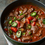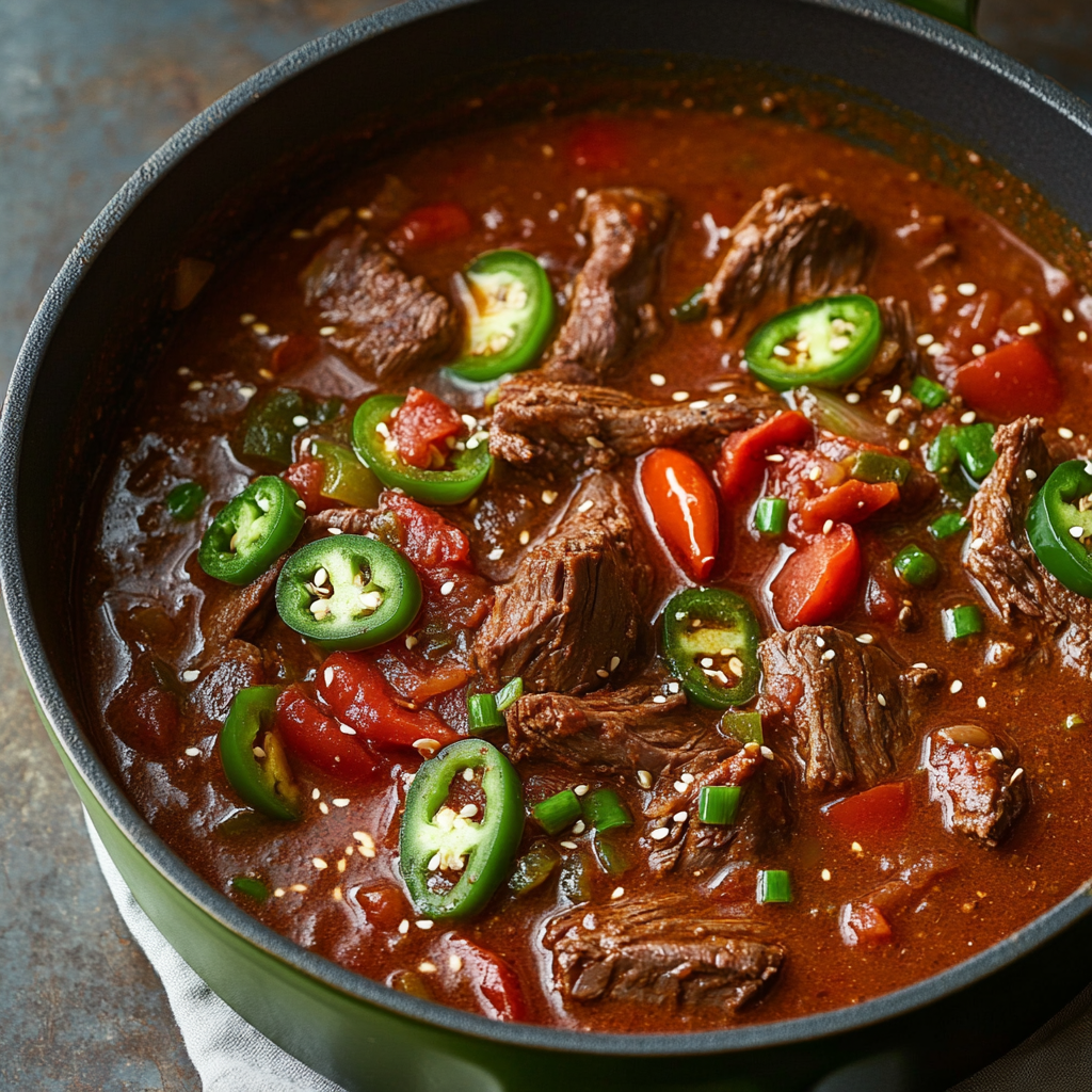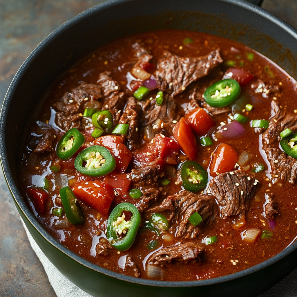 Korean Chile Con Carne is a spicy twist on traditional chili, combining savory beef with Korean spices like gochujang for a unique flavor profile.