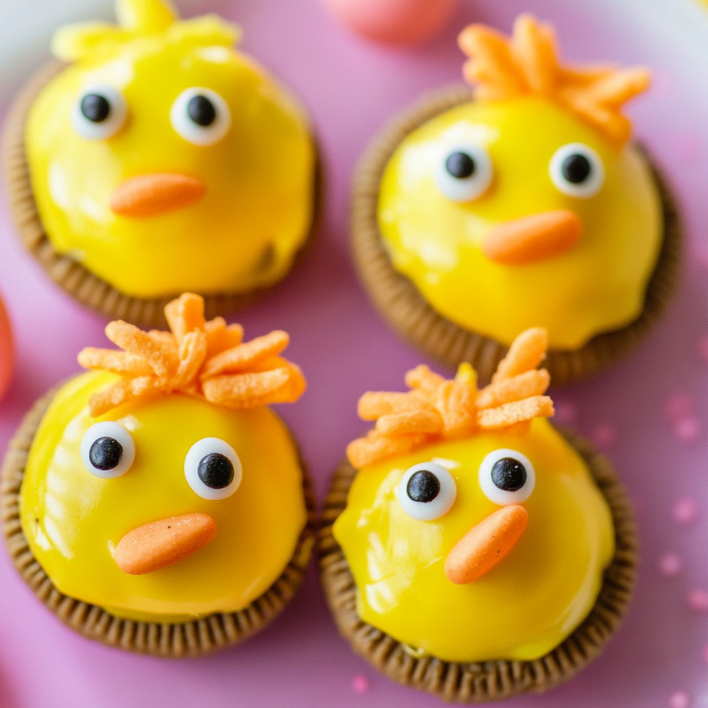 • Arrange Oreo Easter Chicks on a large platter surrounded by pastel-colored candies and chocolate eggs for a vibrant dessert display.