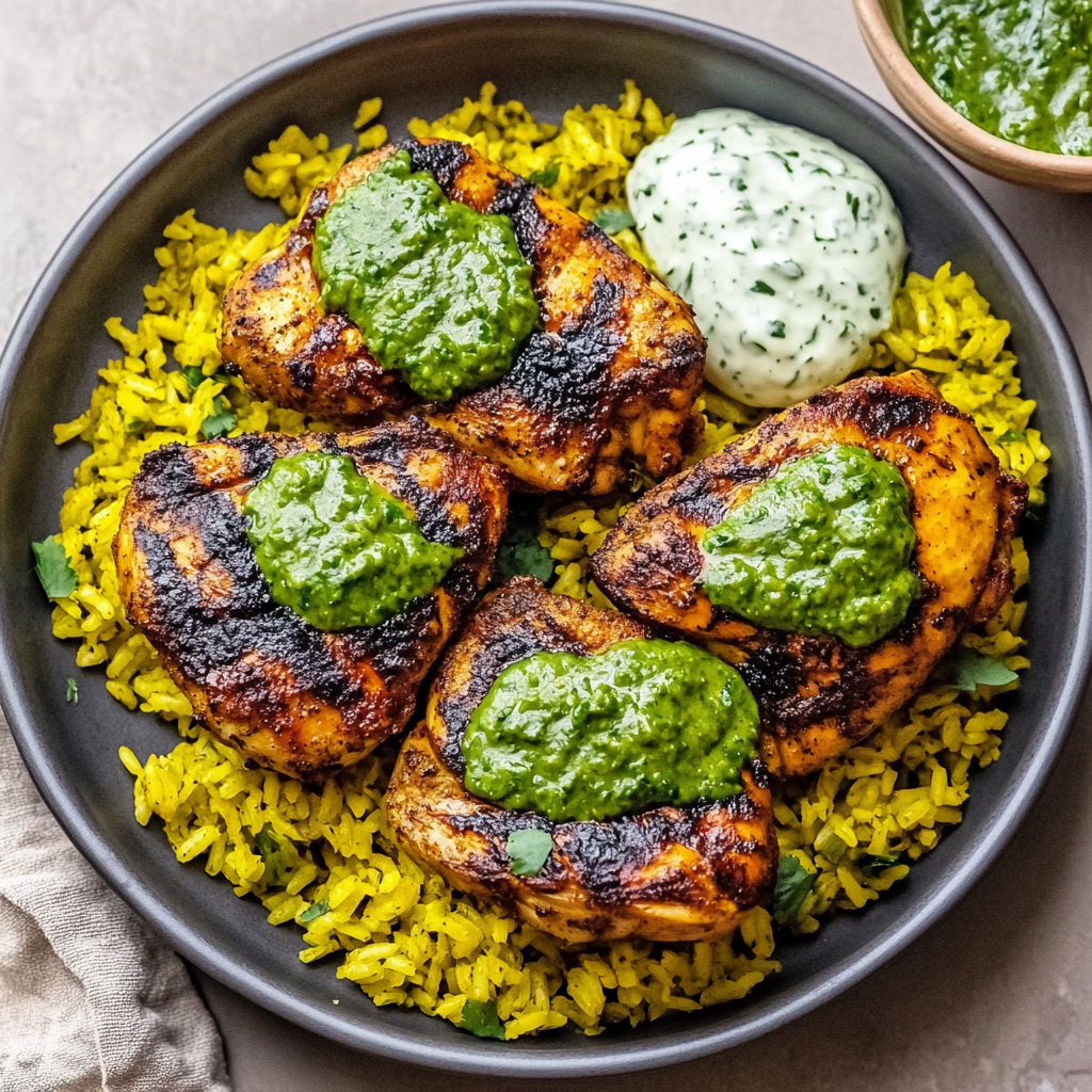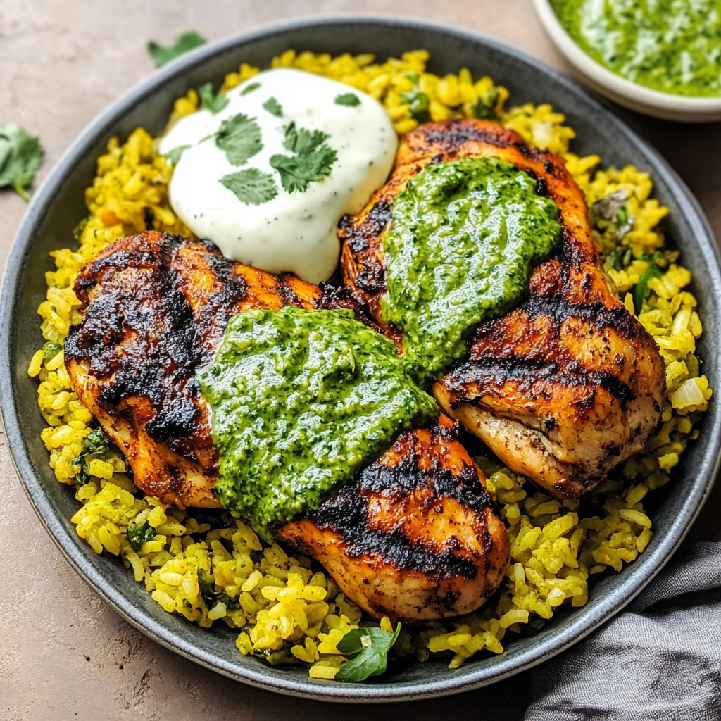6. Serve grilled chicken over yellow rice and drizzle with green sauce.