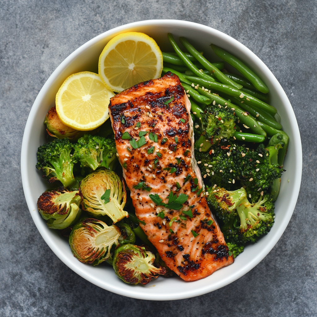 Layer your cooked salmon on top of roasted Brussels sprouts, sautéed green beans, and steamed broccoli in a bowl. Finish with a squeeze of lemon juice or sprinkle red pepper flakes if desired.